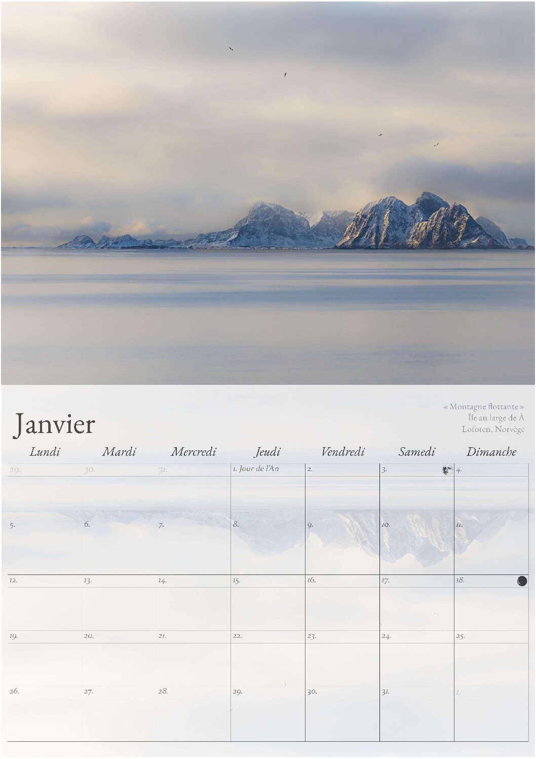 Chaque double page comprend une photo au format A4 en haut et un calendrier pleine page en bas utilisant du papier mat pour faciliter la prise de note ! (Papier Olin offset pour un toucher doux et une texture subtile)